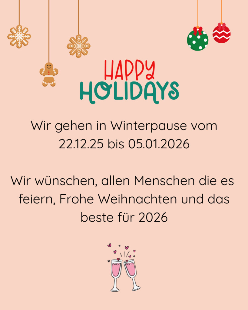 Wir wünschen allen Menschen, die es feiern, schöne Weihnachten und ein gutes Jahr 2026. Ab dem 05.01.26 sind wir wieder für euch da, dann können Termine für Testungen und Beratung per Telefon oder E-Mail vereinbart werden.