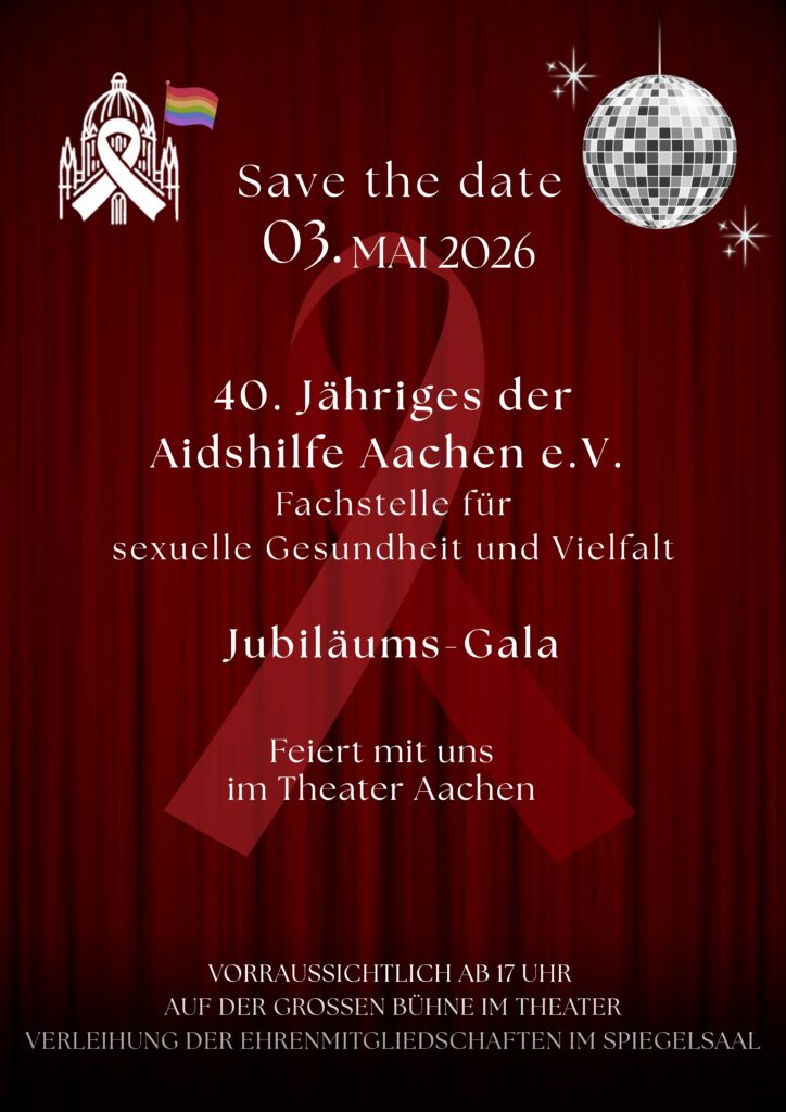 Die Aidshilfe Aachen e.V. wird 40 und das feiern wir mit euch: Am 03. Mai 2026 laden wir zur Jubiläums-Gala im Theater Aachen ein. Freut euch auf einen festlichen Abend mit Musik, besonderen Momenten und einem Programm, das wir aktuell noch finalisieren.